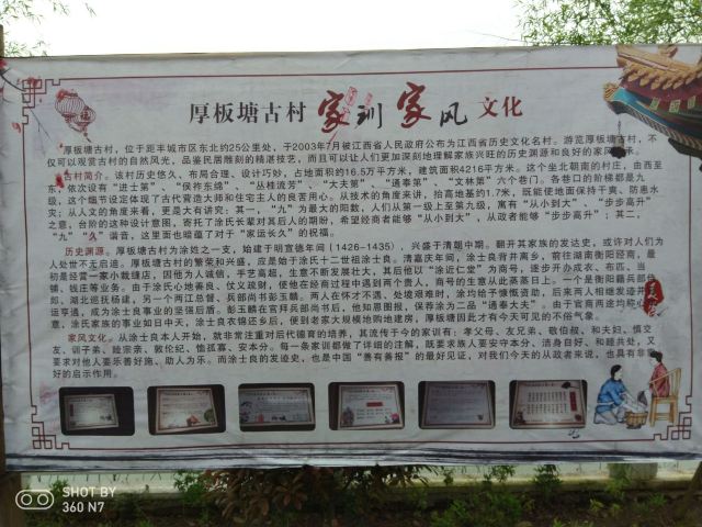 厚板塘村始建于明代宣德年间(1426-1436),为涂姓一支聚族而居。是一个封建官商结合典型、贫富对立悬殊、等级制度森严的历史文化古村。