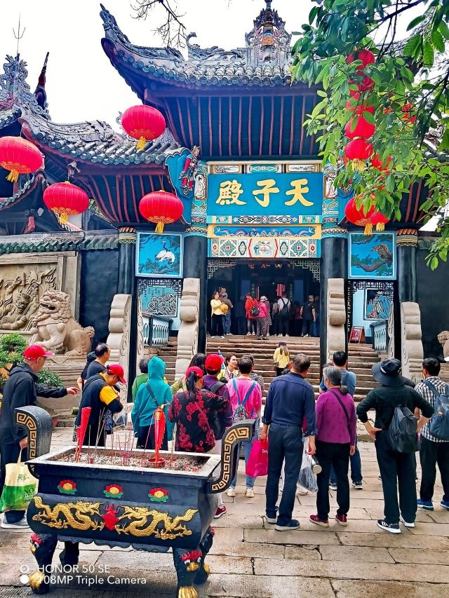 3、天子殿始建于1600多年前的西晋、重修于清康熙三年(1663年),主祀阴天子,导游笑称祭拜神佛全国有很多处,但祭拜阎罗王全国仅此一家,不开分店。阴天子后的“娘娘殿”主祀阴天子夫人卢瑛;天子殿两侧的“东西地狱”还原了恶人在阴间所受的酷刑,虽然有些慎人,但也生动形象,告诫人们勿做坏事;天子殿门前有块“考罪石”,导游说单脚脚掌站在鹅卵石上作金鸡独立姿势,眼睛望着殿门口“神目如电”牌匾,坚持3秒以上可以证明“无罪”。