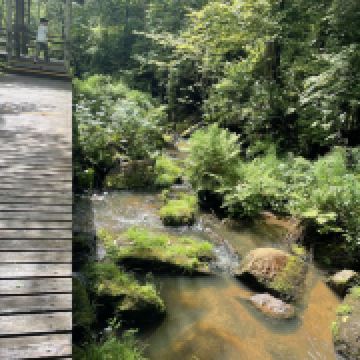 响水溪就是五营国家森林公园的一个神奇之地。溪水从山岩裂隙中奔涌而出,声如琴瑟,清脆悦耳,故名“响水溪”。此溪水自深山密林处地下涌出,绕山脚岩石蜿蜒而下,一路欢歌,延绵数千米,水清如碧,冰而侵骨,入口甘甜。两岸草木葳蕤,蕨苔遍地,毛赤杨成荫,杜鹃花点缀其中,又有青松挺拔、白桦玉立,山间则是红松高耸,溪畔更有朽木陈横,加之奇石壁立,鸟语花香,微瀑处处,实乃“观山水灵秀,赏柳暗花明”。赏溪甬道用实木沿溪而建,九曲徘徊,幽廊围香,亭阁揽绿。正可谓:兴安胜景无寻处,溪水响天林中来。