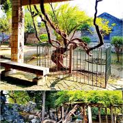 衙堂之后是历代衍圣公及家眷的住宅,走到后面是景点的后花园。花园不大,但假山、池塘、竹林、亭台、曲桥等俱全,还建有敬花神的石坛、赏月的凉台、焚香读书的坛屋。花园内有一棵四百多年树龄的柏树,一树生五支,中间生一株槐树,被称为“五柏抱槐”,是一大奇景。