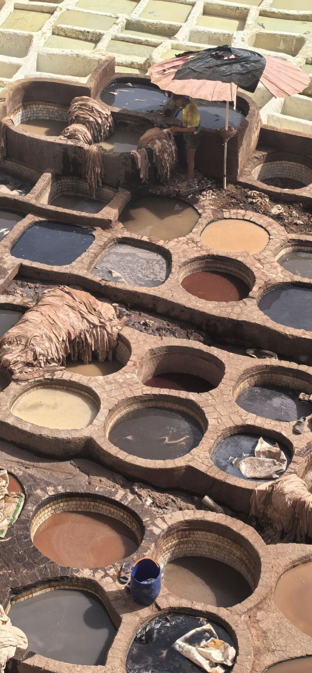 参观乔拉制革厂前每人都会给一支薄荷叶,要将薄荷叶放在鼻子处,才不会被刺鼻的气味呛到。染槽都在楼顶上,游客可以在房屋高处俯瞰了整个染坊,之后被带到皮具陈列处,每一层都是不同的产品,颜色都比较鲜艳,款式基本上是当地的风格。