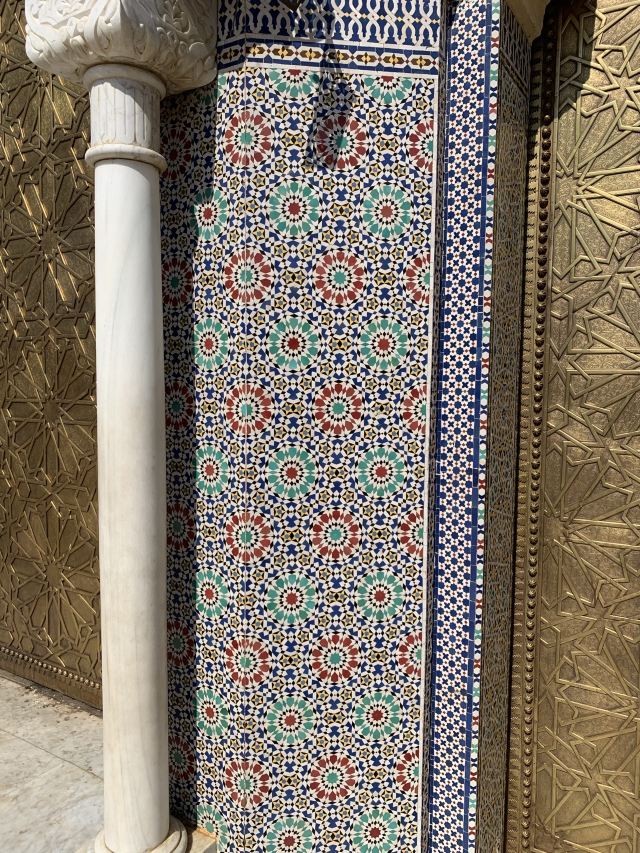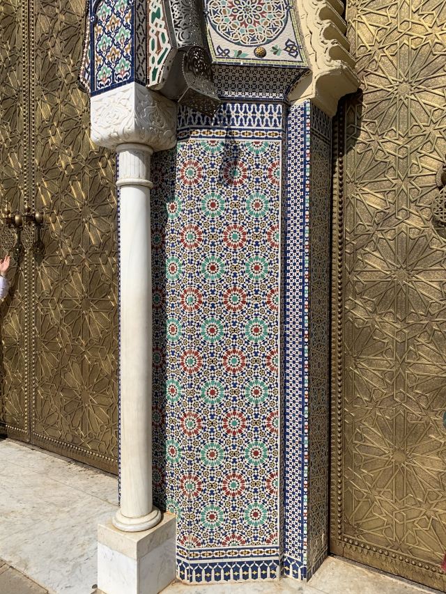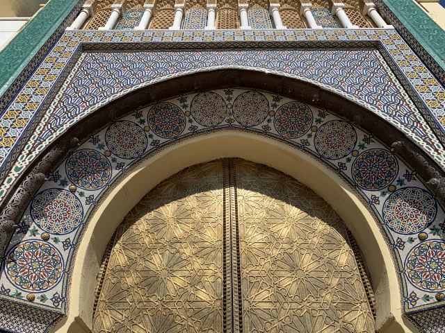 虽然皇宫不对外开放,但是仅仅在宫门外参观也不错。菲斯皇宫的城门上有非常精美的摩洛哥装饰艺术,无论是门框上的马赛克艺术,还是城门和门环上的黄铜雕刻艺术,都值得仔细观赏。而且,游客在这里是可以抵近观看的,这样的待遇在拉巴特绝对不会有。