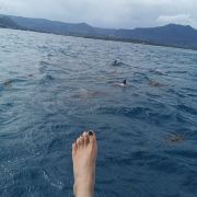 成群结队的海豚乘着海浪在海中欢快的游弋着,此时,你可以跳下水和它们一起畅游大海,追逐它们。在海中,一缕一缕的太阳光束射进海里,眼前仿佛一个金壁辉煌的宫殿,你可以看到十几米深的海底布满了珊瑚,视野范围内百余只海豚成群结队游走,一会儿到海面换气,一会儿又沉入海底,非常美妙。