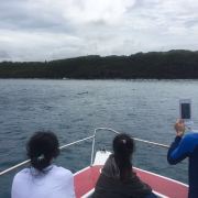 当海豚出现时,周边所有的人都开始兴奋、欢呼,整个海豚湾都洋溢着欢乐。海豚时近时远,船只不停追逐着海豚,每当有海豚游在船前,船上的人都会非常兴奋,惊呼不断,而海豚往往也会回应人们的惊呼声,快乐地跃出水面,甚至来个漂亮的前空翻。海豚不时窜出水面,惊呼声此起彼伏。
