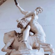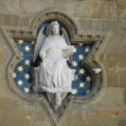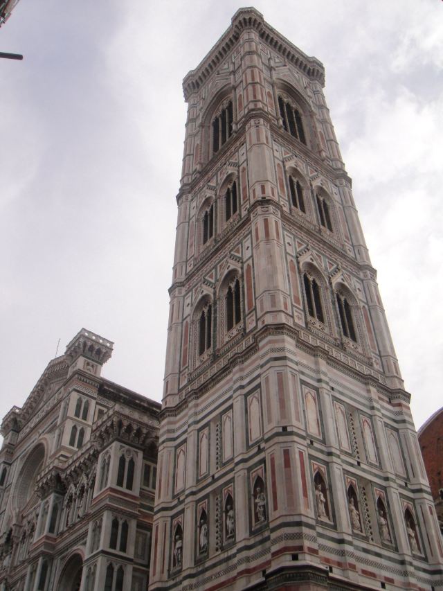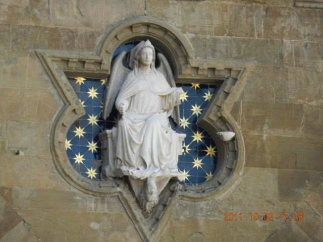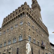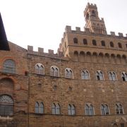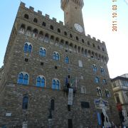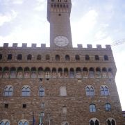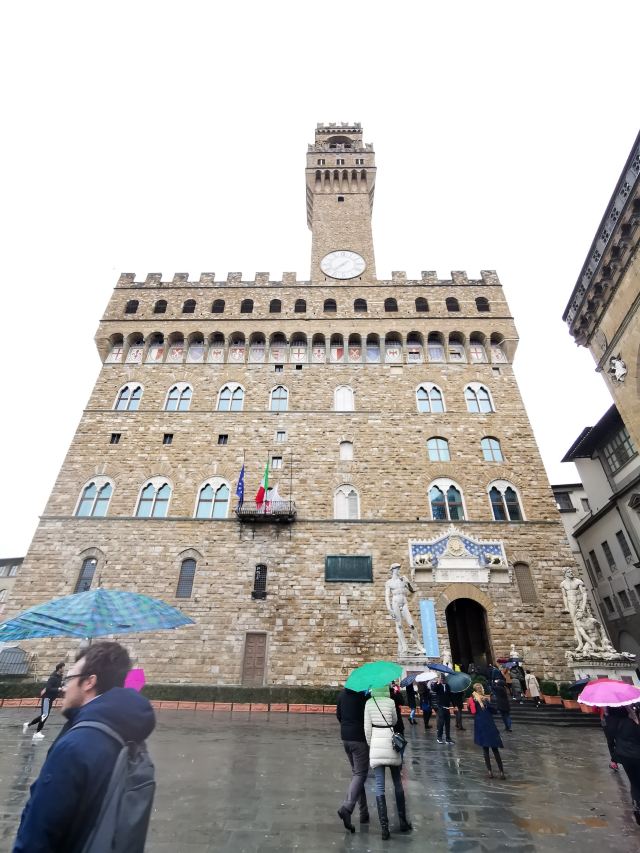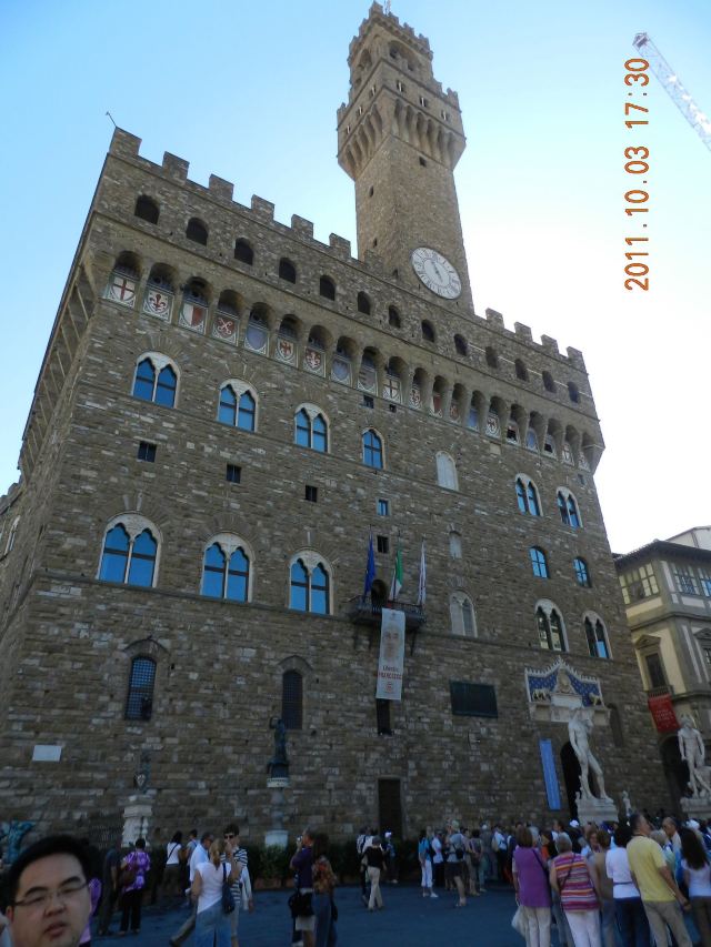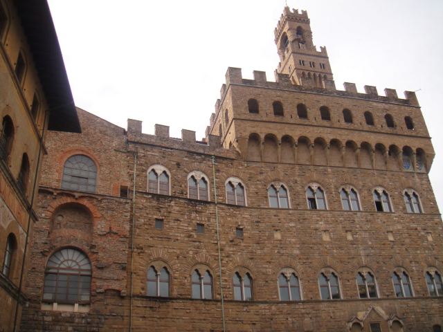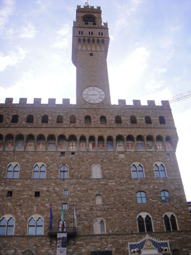 旧宫的入口处装饰着城市徽章,一楼大厅里有众多雕塑,米开朗基罗的《胜利》就在其中。里面是一个博物馆和一个五百人议事大厅,议事大厅不允许参观,但是塔楼可以登顶。塔楼高94米,就像是旧宫的一顶皇冠,从这里可以眺望圣母百花大教堂。