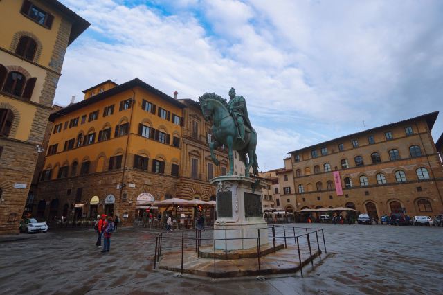 水池的北边竖立着章博洛尼亚创作的美帝奇家族科西莫一世骑马像,它比这里其他的一切见证了更多佛罗伦萨的历史。广场四周是造型朴素的历史建筑。傍晚从市政厅广场穿过,可以听到拉琴的艺人。琴声飘荡,令人心醉。夏季游客多的时候,还会有艺人在广场跳舞。