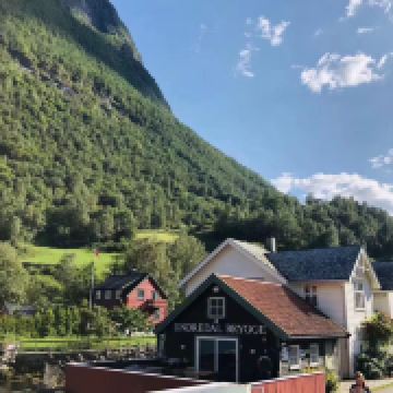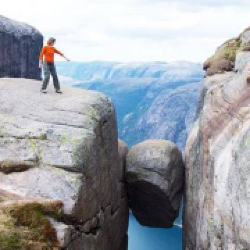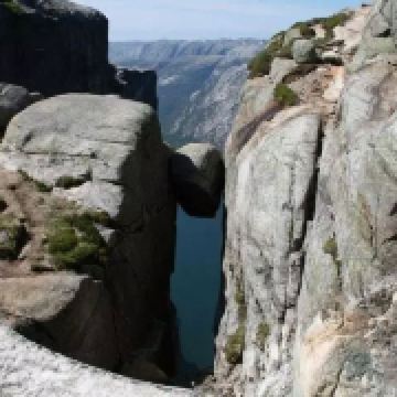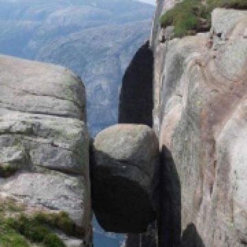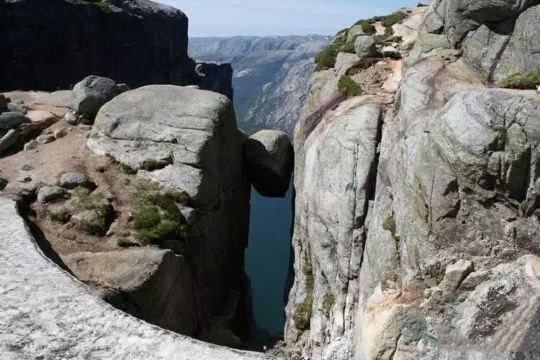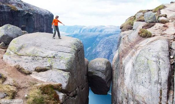这是峡湾内的又一大奇石,位于谢拉格山中,这块直径约为2米的岩石悬空于峡湾1000米之上,夹在两块巨岩裂缝中,很是壮观。