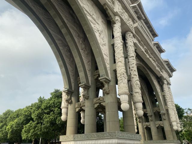 刚踏入顺峰山公园,一座庄重典雅的中式牌坊便映入眼帘。这座被誉为亚洲第一牌坊的石牌坊,由2万余块岩石镶嵌而成,宽88米,总高度38米,总重量达1.4万吨。牌坊的雕刻工艺精湛,正面雕刻着“顺峰山公园”五个大字,背面则刻有“顺峰揽胜”四个字,还有双狮戏珠、九龙戏珠等精美图案,每一处都透露出精雕细刻的美,让人不禁赞叹古人的智慧与技艺。