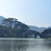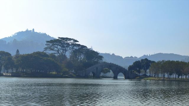 穿过牌坊,眼前是一片开阔的湖面,湖面上横卧着五座石拱桥,名为五行桥。桥身古朴典雅,桥下流水潺潺,湖水在阳光的照耀下波光粼粼。站在桥上,远处的青山、近处的湖水、身旁的古桥,构成了一幅绝美的山水画卷。微风拂过,湖面上泛起层层涟漪,仿佛在诉说着古老的传说。