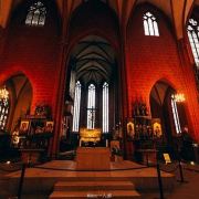 教堂内高耸的弧形穹顶气势威严,四根硕大的基柱更是在顶部组成了“皇冠”的形状,硕大的玻璃窗虽无华丽的装饰,但良好的采光使得教堂内部更为圣洁明亮。中央祭坛颇为瞩目,主祭坛建于15世纪,其上的浮雕表现了耶稣受难的场景。中央祭坛钱的彩色雕像遗迹北侧翼廊的彩绘浮雕也十分特别,很值得一看。