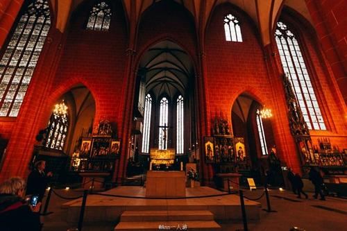不同于一般哥特式教堂的灰黑肃穆,法兰克福大教堂的墙体呈砖红色,建筑线条简洁流畅,相对繁复的建筑就是高耸的塔楼,塔楼建于15世纪,高达95米,在法兰克福市的很多地方都能一眼望见它,十分醒目。塔楼内有322级台阶直通塔顶,支付3欧元即可登塔饱览法兰克福市的城市风光,但塔内空间较狭窄,攀登时要注意安全。