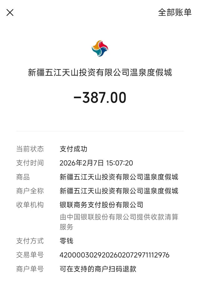 5分 超棒新疆阜康五江温泉城位于天山天池景区旁,地处世界黄金温泉带,交通便利。这里有66个户外温泉池及多个私密汤池,泉水富含矿物质,还设有红酒池、牛奶池等特色汤池。除了温泉,室内还有水上乐园、台球厅等娱乐设施。酒店服务热情周到,房间干净整洁。此外,景区内消费明码标价,还融入了新疆当地文化。无论是亲子出游还是情侣度假,这里都是不错的选择。