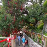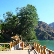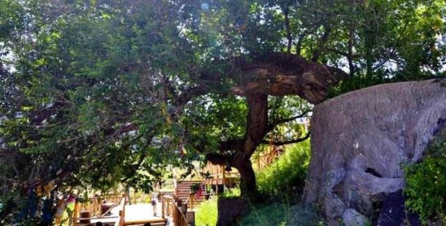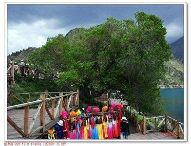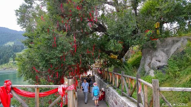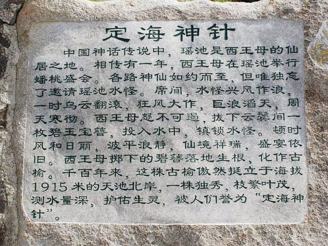 3、定海神针:位于天池北岸,“天池八景”之一,是一棵古榆树,由大叶榆和小叶榆的杂交所生,相传王母娘娘召开蟠桃宴,天池水怪未被邀请便兴风作浪,被王母娘娘用自己的碧玉簪降服,簪子后来化为此树。海拔2000米本不适于榆树生长,天池每次水位上升又恰巧不漫过此树,可见其神奇性,因此它的枝条上挂满了红色祈福带。