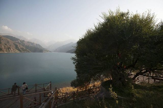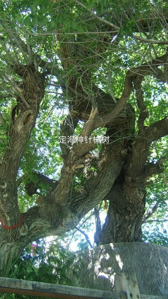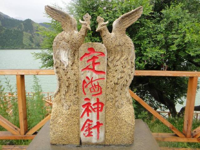 在天池湖岸边有一棵郁郁葱葱、枝繁叶茂的大榆树,是天山天池的周围方圆几公里内仅剩的一棵榆树,海拔也非常的高,这就是天山天池八景之一的“定海神针”。树冠大如伞,状如帝王金舆华盖,即使丰水年,湖水再涨,也只能漫到其根部,从来未被天池湖水淹没过,尤为奇妙。