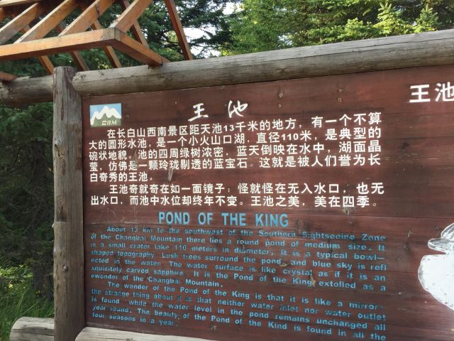 我们是参观完天池后乘坐景区大巴到了这个景点,下车后走了很长的路程才到了这里。沿途绿色葱郁,野花点缀着道路两旁,景色倒是很不错。到了景点,王池的湖面很晶莹,水平如镜,湖的四周绿树浓密,蓝天绿树倒映在湖面上,可以说景色如画。只是美则美矣,但王池的规模实在太小了,也就象一个小水潭,稍微驻足就已经浏览完全景。如果说天池是一位仪态万千的大家闺秀,那么王池也就是一个秀丽通透的小家碧玉。考虑到下车后漫长的路程和体力的消耗,如果时间紧张或者体力有限的话,王池倒是个可有可无的选择。