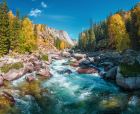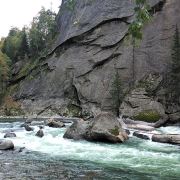 额尔齐斯大峡谷是可可托海风景区的主景区。峡谷内山水交错,灵气逼人,山、水、石、树、人交相呼应,沿河两岸群峰相对,飞来峰、骆驼峰、象鼻峰、神鹰峰等形象逼真,号称“一百单八峰”。