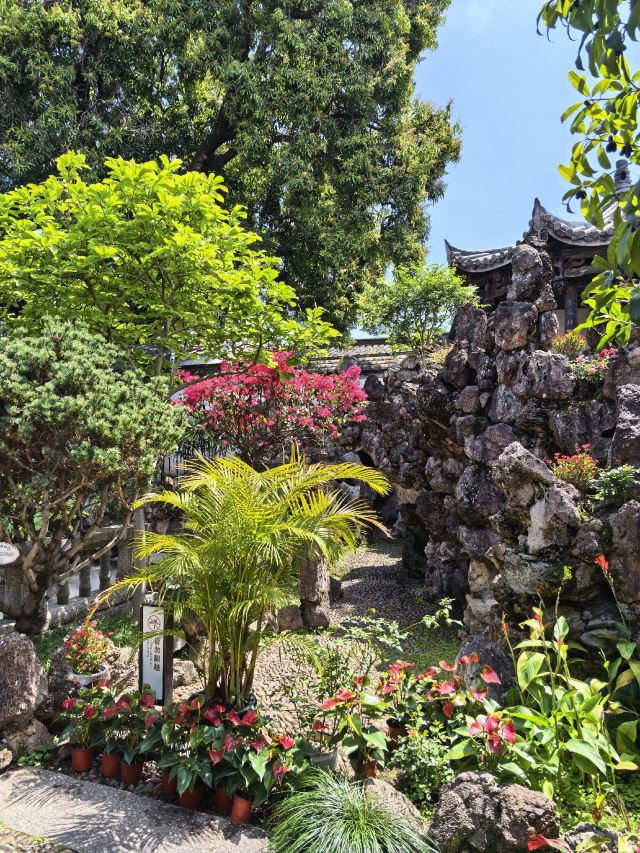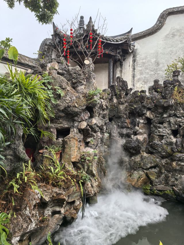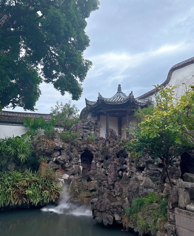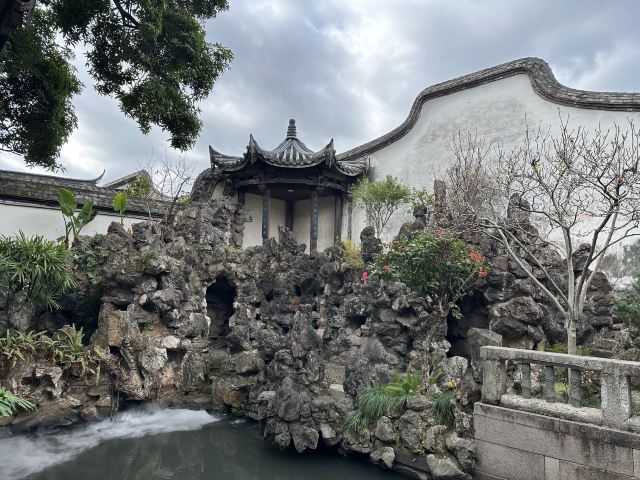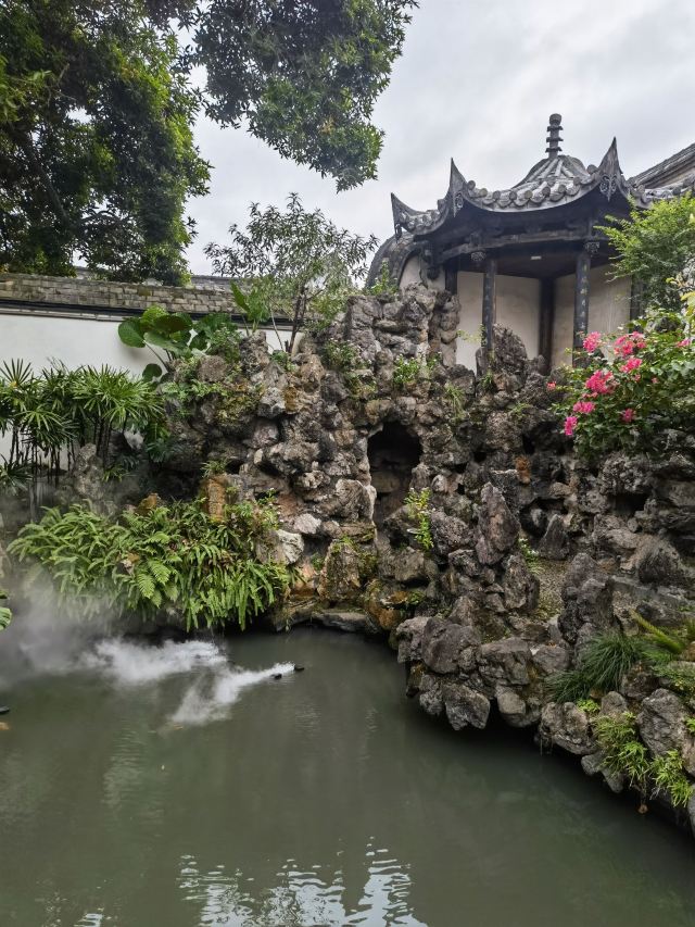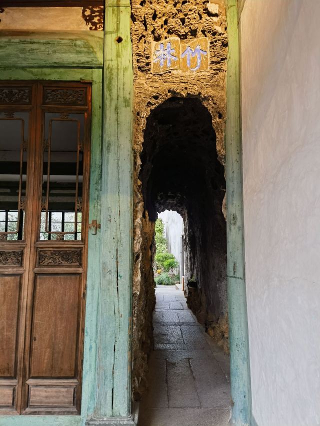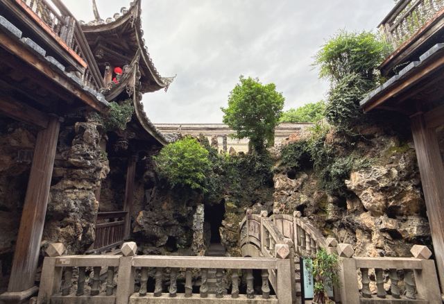 天井太湖石假山旁,石拱桥刻“知鱼乐处”;半边亭垂柱雕松鼠、谷穗,融闽地民居与江南园林于一体。