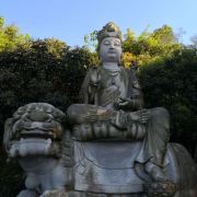 罗汉石像之间,还有虎、豹、狮、象等飞禽走兽的石雕像杂处其中。登上寺后山巅,一望无边的大海,尽收眼底。