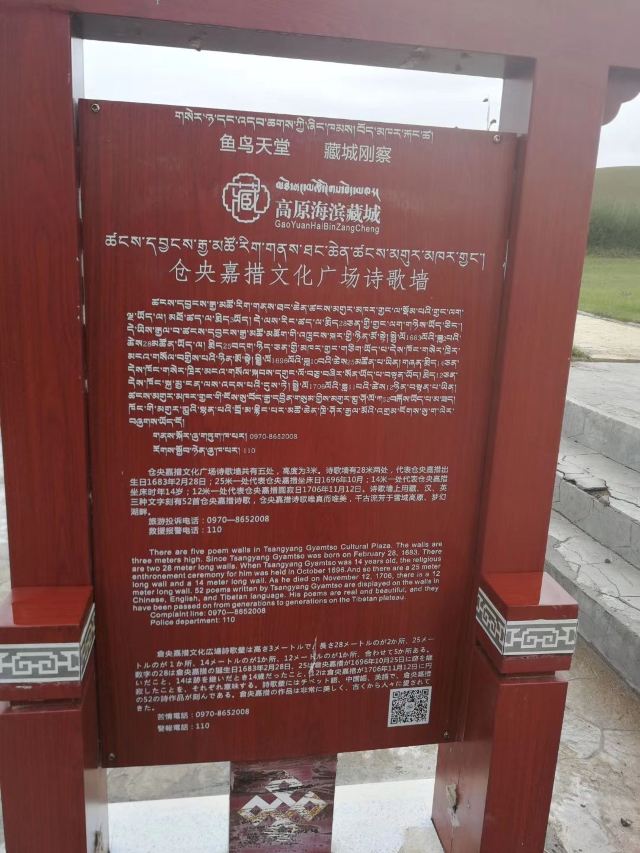 仓央嘉措一生充满传奇,他出众的才华,成就了他在藏族诗歌艺术圣坛上的地位,他写下了世间最深情的诗篇,演绎世间最美最纯的情怀,他用年轻的生命,阐释了诗歌之美、佛法之真。这位诗歌大师,藏传佛教的圣者就这样驻足环湖草原,在圣洁的青海湖仙女湾悄然遁去,他和他的诗歌在青海湖得到了永生。善良而质朴的刚察人民修建了别具一格的仓央嘉措文化广场,让世人徜徉于仓央嘉措神圣的文化乐园,领略世间最美的诗歌,品味和感悟大师最具人格魅力的一面,它印证了刚察儿女最深情的缅怀和追思-永远怀念这位步入红尘之中的圣者。仓央嘉措诗歌千古流芳于雪域高原、梦幻湖畔,青海湖的风声入禅,那湛蓝的湖水,溅落在草原儿女的双眸间,闪现一缕最耀眼的光芒,如同仓央嘉措充满人性的诗歌,普照世间所有的心灵。