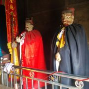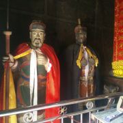 从塑像组合上看,除无量殿、玉皇洞为群塑,孔子洞、伏羲、灵官洞为单体塑像外,其余洞中全部是一主尊二待者的造像布局。壁画的绘制和布局在各洞窟中表现基本一致,除无量殿和释迦洞有故事画外,其它均是在左右两壁绘单俱物画,窟顶为圆光扇面或书画。