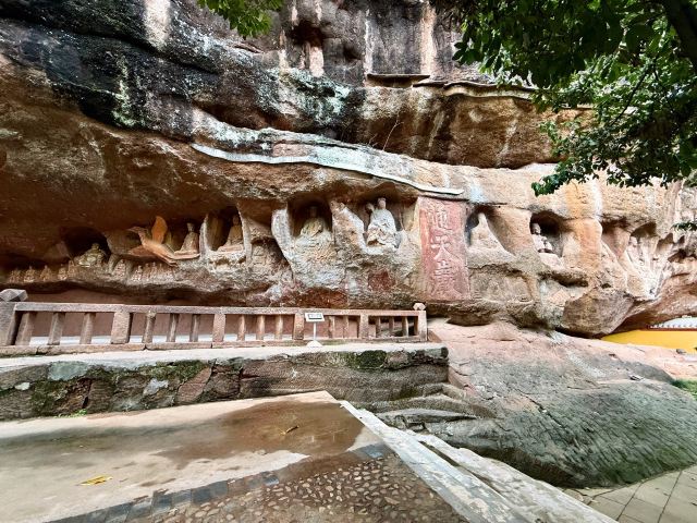 往后欣赏过龙虎岩的宋代石刻,就是通天岩的核心游览区了,这是一处环形的山壁,峭壁上的8尊唐代造像是通天岩的石窟年代久远的作品。石龛中,宋代毗卢遮那佛的禅定像,以及旁边石壁上层叠的五百罗汉浮雕气势恢弘。中心区域内,还有依山而建的广福禅林、囚张学良将军的双桂堂、避暑山房等等,环境清幽,可在禅寺中祈福。