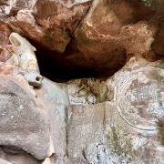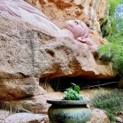 进入景区,走过一个小人工湖和瀑布,再走两三百级台阶就到达了景区的内圈。第一个到达的便是观心岩,这里大洞套小洞,据说曾是明代哲学家王阳明的讲学处。顺石阶而行,不远便是忘归岩,忘归岩的山腰有一处丹霞穿洞,尤其在夏季,凉风习习,使人流连忘返。这里值得一看的便是王阳明的诗刻,穿过幽谷,抬头可见悬崖绝壁上的罗汉像。岩洞前方是舞厅,如今里面可看的只有些照片之类的介绍。
