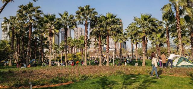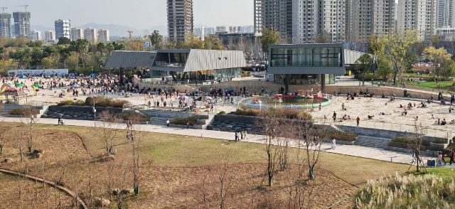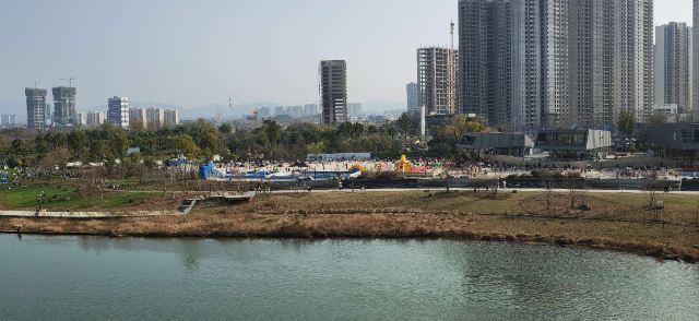 蓉江新区滨江公园绿植丰富,种植有樱花树,柳树等,新增了音乐喷泉,吸引很多人前来观看。