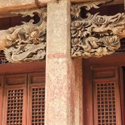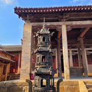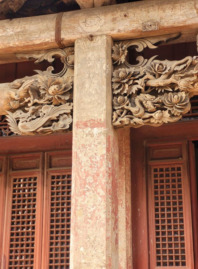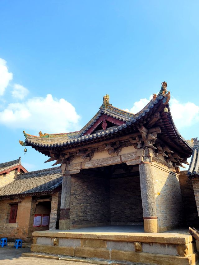 1.戏台:中国最古老的戏台,如今已800多岁,翼角高翘,内部精简。台基高1米,上有文字记载,这高度既抬高演员位置又减少声音传导损耗,台后的三面厚墙,又可将演员声音聚拢,我站在上面高唱了一曲,感受了古人对扩音器的妙用