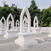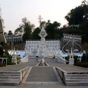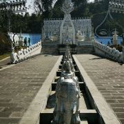 勐焕银塔占地面积约120亩,塔高66米、直径46米。整体建筑以纯白为基调,与勐焕大金塔在色彩上形成鲜明对比,两塔屹立在雷崖让山之巅、孔雀湖之畔,一个雍容华丽,一个典雅素静。