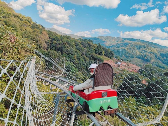 闲庭信步,缓缓走下407级台阶或是乘坐刺激的森林滑道,乘坐滑车呼啸而下,时而置身树林,时而置身蒿草丛生的山野世界,时而置身于清香四溢的茶园,滑车转弯时惯性带来的“脱轨感”更是让人心跳加速,大呼刺激。