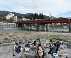 这是位于飞驒川河床的露天浴池,可以全身浸泡或者坐下来泡脚看山上的美景,安逸舒适。