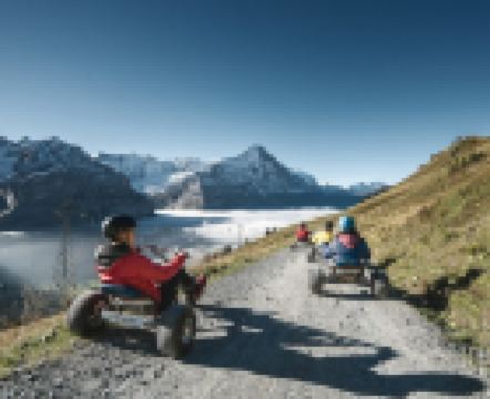 在First山高空缆车站附近有知名的First Flieger飞索项目,这种速降椅可以让四个人同时沿着索道在空中滑翔,全程800米,时速高达84公里/小时。这项体验活动安全而刺激,老少咸宜。