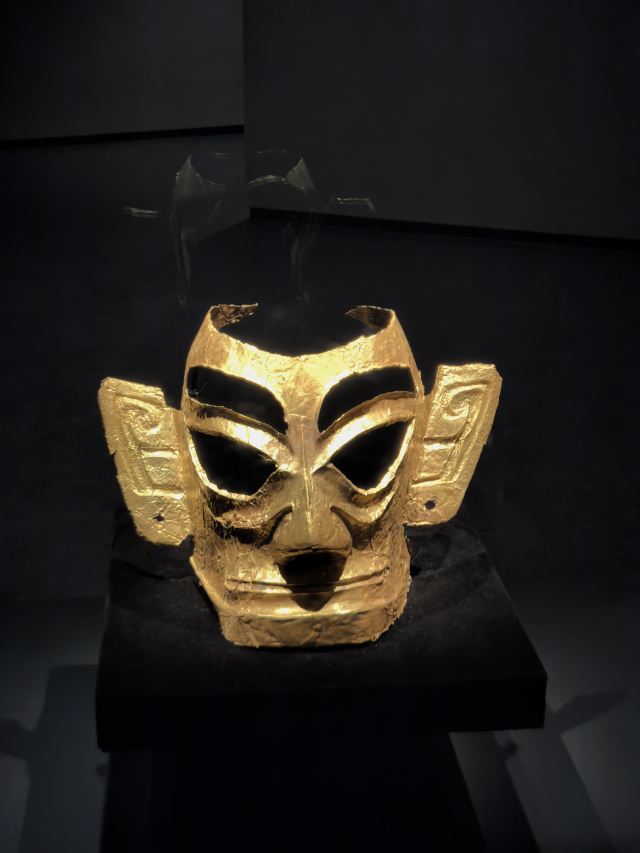 金面具铜人头像(42.5 cm,金皮捶拓,眼眉镂空)