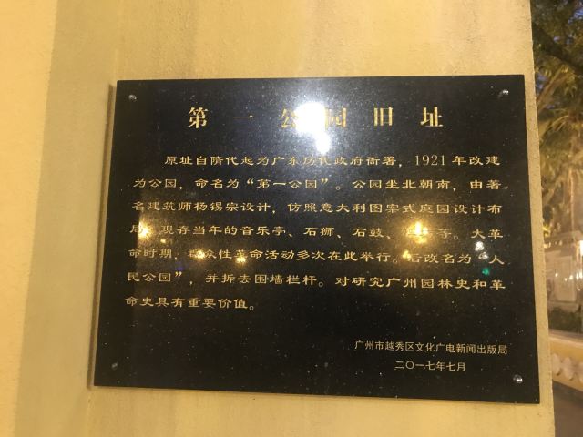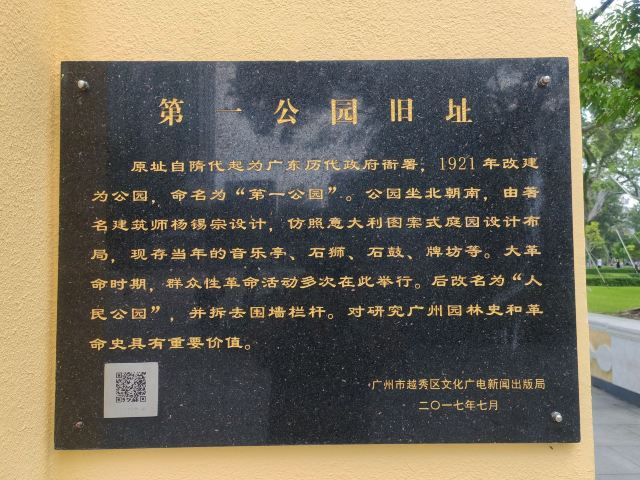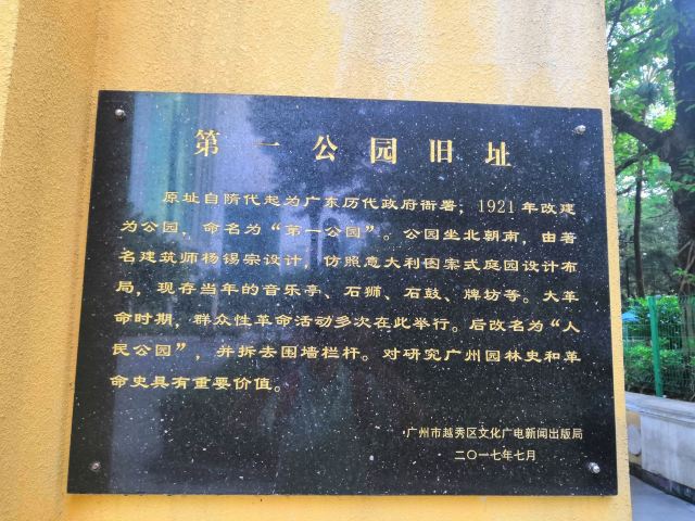 该公园位于广州市传统中轴线上,面积4.46万平方米,是广州早期建立的综合性公园。园址从隋朝起均为衙门官邸。元代为广东道肃政廉访使署,明朝为都指挥司署,并曾为南明绍武王宫,清代先后为平南府和广东巡抚署。