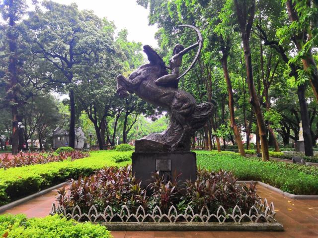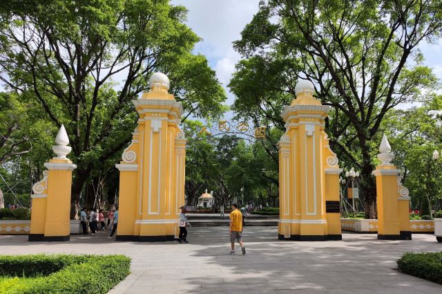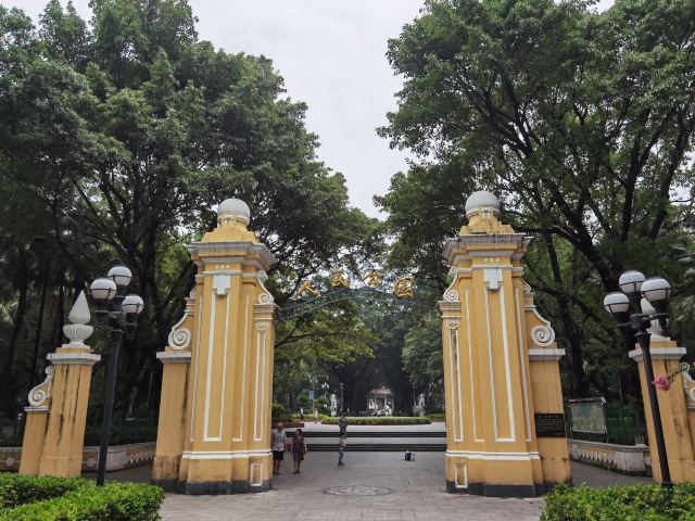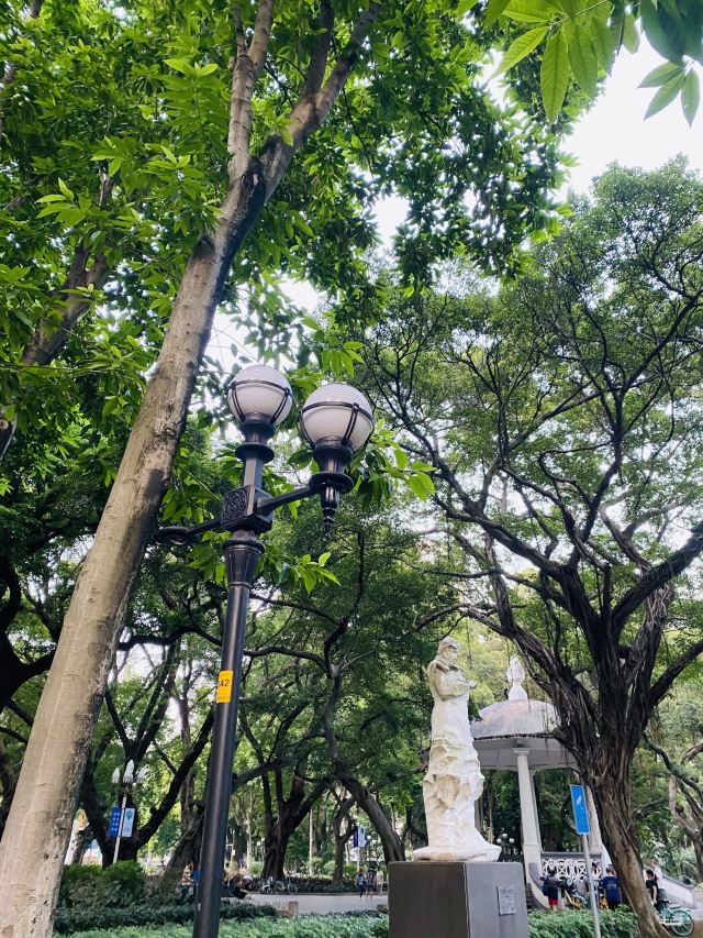公园采取意大利图案式庭园布局,呈方形对称形式。园内古树参天,绿篱花丛,富有浓郁的地方特色。有清初雕制的汉白玉石狮及1926年修建的音乐亭。后陆续增设了盆景园、儿童游乐场、敬老亭、露天音乐茶座,展览大楼等设施,1987年又建成《烽火年代》、《鲁迅》、《冼星海》、《猛士》、《新娘》、《椰林少女》等 6座雕塑。塑像根据题材需要分别采用青铜、黄岗石、汉白玉、红粉石等材料制成,使作品更加有富有生命力。从1978年开始,公园每年都举办菊展、迎春花会和中秋灯会。