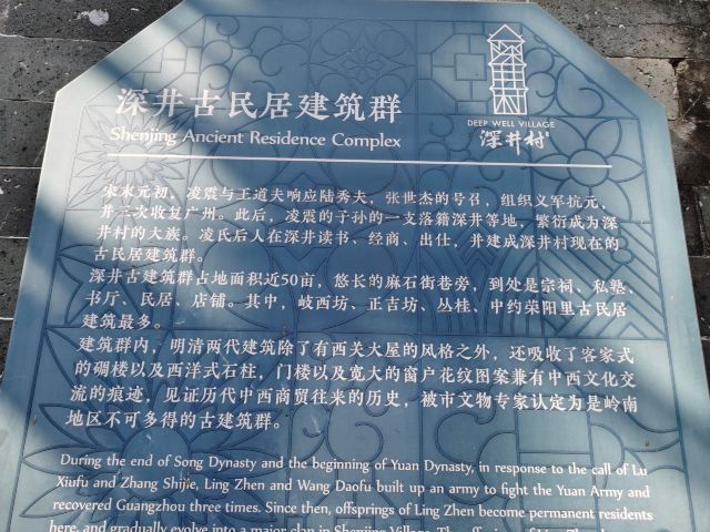 井古村落有近千年历史,位于黄埔长洲岛上,大学城和黄埔军校中间。分别和番禹化龙、海珠区新洲、天河隔江相望。村落内石板街和青砖房屋比比皆是,对于喜欢古建筑的人来说这里不是为一个双休日的好去处。长洲过去是对外贸易的集散地,深井村民多从事码头搬运、造船、经商等,村民生活富裕,村落建设华美,具有珠三角风情的青砖大屋、石板街巷比比皆是,其中正吉坊、岐西和荣阳里是古民宅集中的三片。值得一提的是,深井古民居除有广州西关大屋的风格外,还吸收了客家式的碉楼和西洋式的石柱、门楼、花纹图案等建筑特色,留有中外文化交流的印痕。