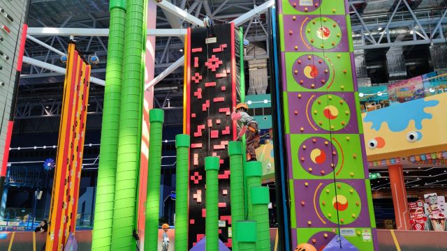 “飞檐走壁”项目拥有面对面攀岩、扭曲面攀岩、垂直跌落滑道等26种元素,设计了适合成人的难度道和充满趣味性的儿童道,老少咸宜。相对于传统的攀岩墙,趣味攀岩墙色彩丰富,个性鲜明的主题能更好地调动小朋友的兴趣。
