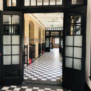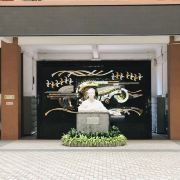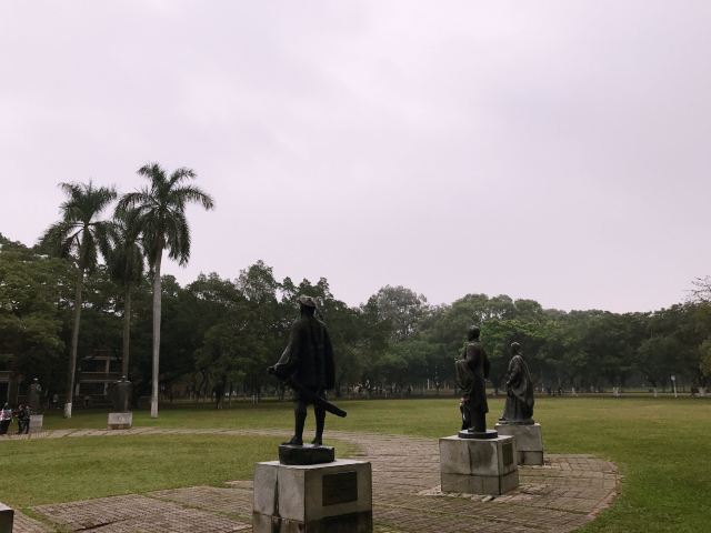走一小段路后,在梁球锯堂前可以看到小钟楼,小钟楼前有中山先生“博学、审问、慎思、明辨、笃行”十字校训,可拍照留念。然后就能看到一大片草坪了,主干道被一片草坪一分为二,这边的重点是怀士堂和西面的永芳堂。永芳堂前有18铜像,是近代对中国历史发生过重大影响的18位广东籍或跟广东有深刻渊源人物,可以去瞻仰下。
