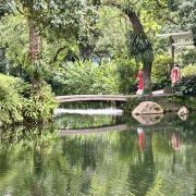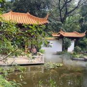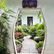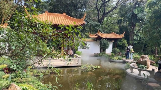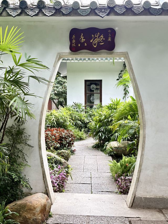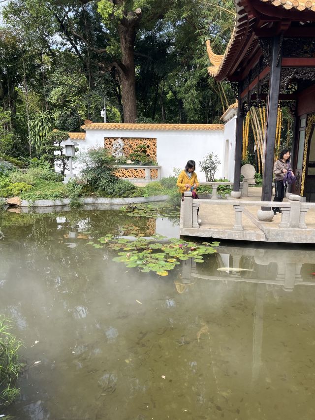 它的门口有2副对联,写着“上国芳馨,南天锦绣”,横批就是“兰圃”二字,写的很有气势。漫步进园内,拱门、堆山、砌石、长廊、水榭,随处可见江南的园林元素,恍然间像来到了苏州的园林,整个公园静谧幽深,环境非常好,空气也因为兰花的香味而格外淡雅有质。