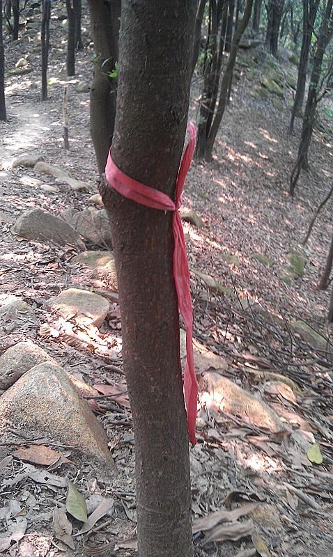 沿路的绿丝带,这是驴友们留下指引路线的。听芳芳说以前有很多,不过沿路上我看见的并不多,估计很多都已经“消失”了。