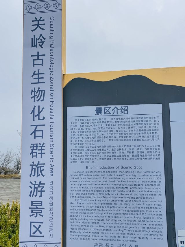 关岭化石群国家地质公园内埋藏的古生物化石形成于距今2.2亿年前三叠纪的海湾,主要包括鱼龙、鳍龙、楣齿龙等海生爬行动物,也有千姿百态的海百合和菊石、双壳、牙形石、鹦鹉螺、腕足及古植物化石。关岭古生物化石,特别是海生爬行动物化石和海百合化石数量巨大、种类繁多、保存精美,为全球同期地层所罕见。