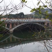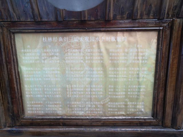4、逆时针从东侧“风雨桥”(侗族四大建筑之一)逛园,桥一侧是湖景,一侧是有关刘三姐的10副画作,上面有刘三姐所唱过的山歌、情歌、骂人歌的歌词,导游会为游客献唱一段。传说中的刘三姐最后骑上鲤鱼升天成为歌仙,现实中的刘三姐扮演者黄婉秋在今年年初刚刚去世,另外,1999年版20元纸币的桂林山水背景里划竹筏的老爷爷也在今年年初去世,很可惜。桥北端细细长长的鼓是放大三倍版的“瑶族长鼓”,鼓面用羚羊皮制成,正常大小的鼓是系在腰间拍打的,又称“腰鼓”,每年三月三对歌节时瑶族人会以鼓会友。桥对面的环湖长廊里展示了少数民族特色服饰。