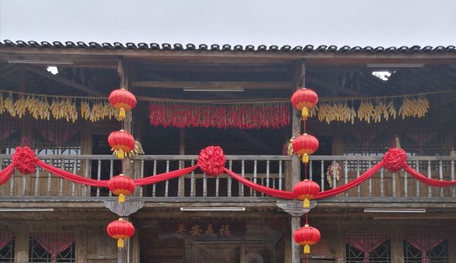 5、景区东北角是反派莫老爷的府邸“莫府”,装饰豪华,内部和二楼都不能进,在建筑外与轿子、石狮同框的效果还是很不错的。莫府隔壁是“阿牛家”,正常民居是三层,一层养牲畜,二层居住,三层储存粮食,但阿牛以捕鱼为生,大部分时间住在竹筏上…