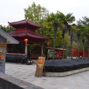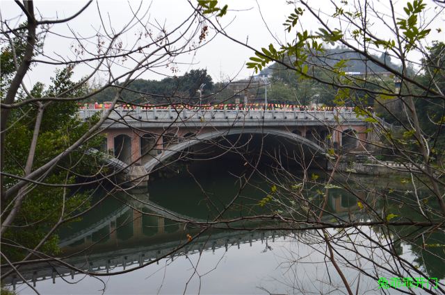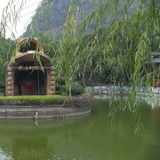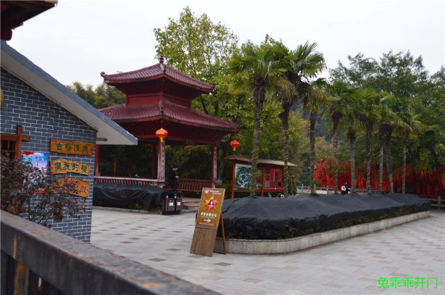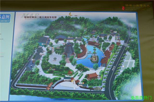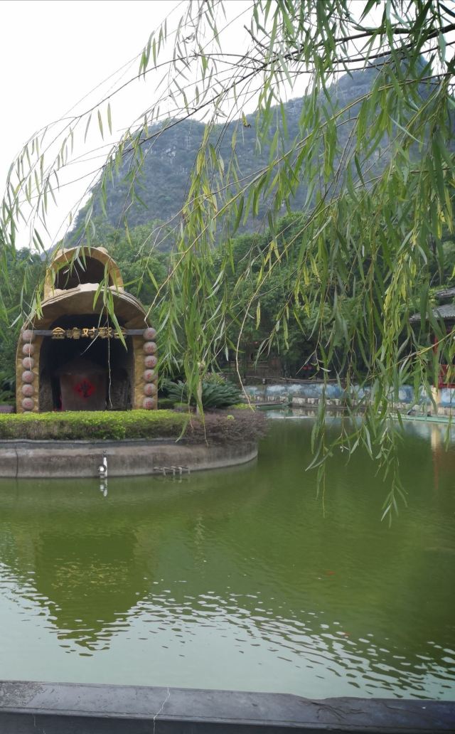 2、景区有免费讲解带领参观,散客需要凑够几人后才能出发,可在门口的“芦笙亭”上休息等待。不过由于旅行团人多随到随走,所以建议随便跟个旅行团听讲解参加互动节目即可。南门是唯一的出入口,进门后正对着的“古榕情缘”是一株上百岁的大榕树,树上挂满了红色绸带,以祈福子孙后代健康平安,树下有放大版的绣球等物件装饰,这里展现的是电影《刘三姐》中刘三姐抛绣球与阿牛定亲的地方。树后是景区官方拍照点,背景是北侧湖中小岛上“金蟾对歌台”上一尊硕大的张嘴金蟾,照相处立有“对歌歌词”,猜想景区以前应该有游客跟对岸歌台中央的工作人员对歌的项目。湖边有风车、竹筏等当地特色小景观,但是通往湖心岛的石桥封闭不能通行。