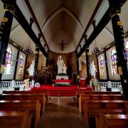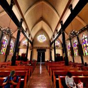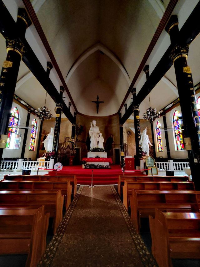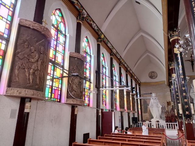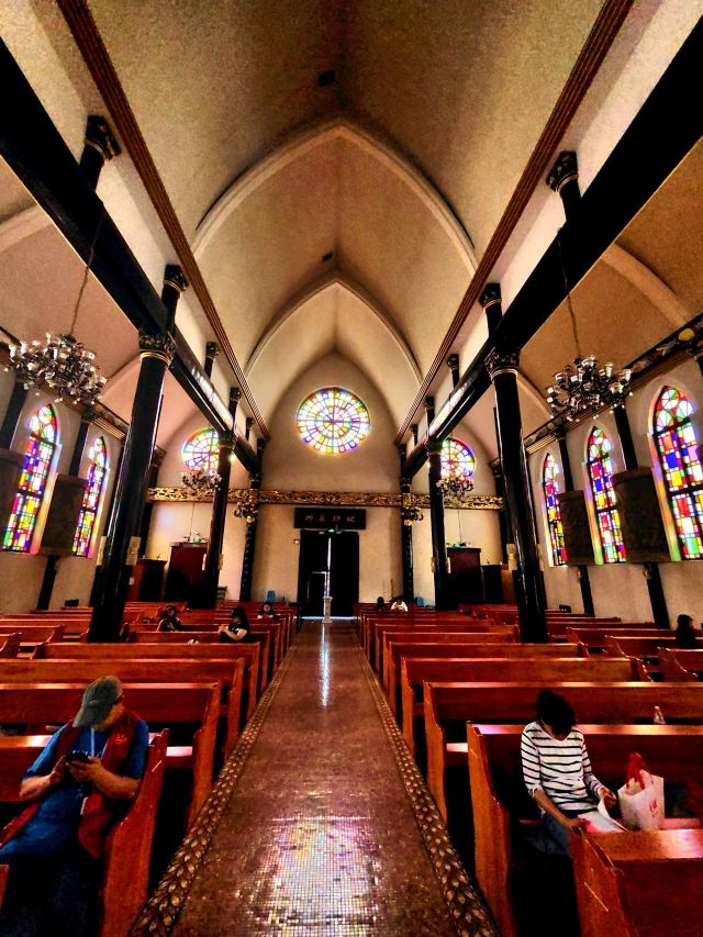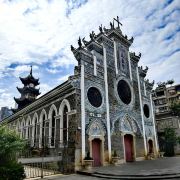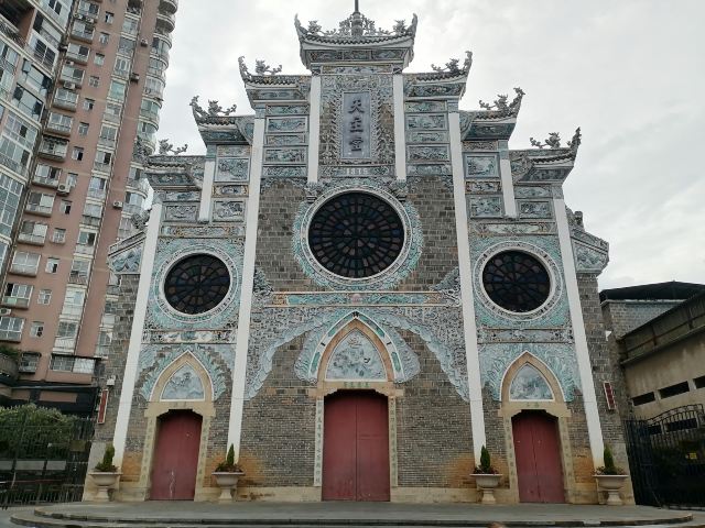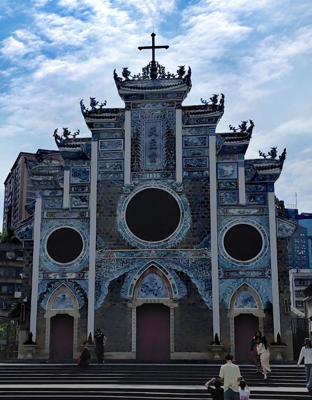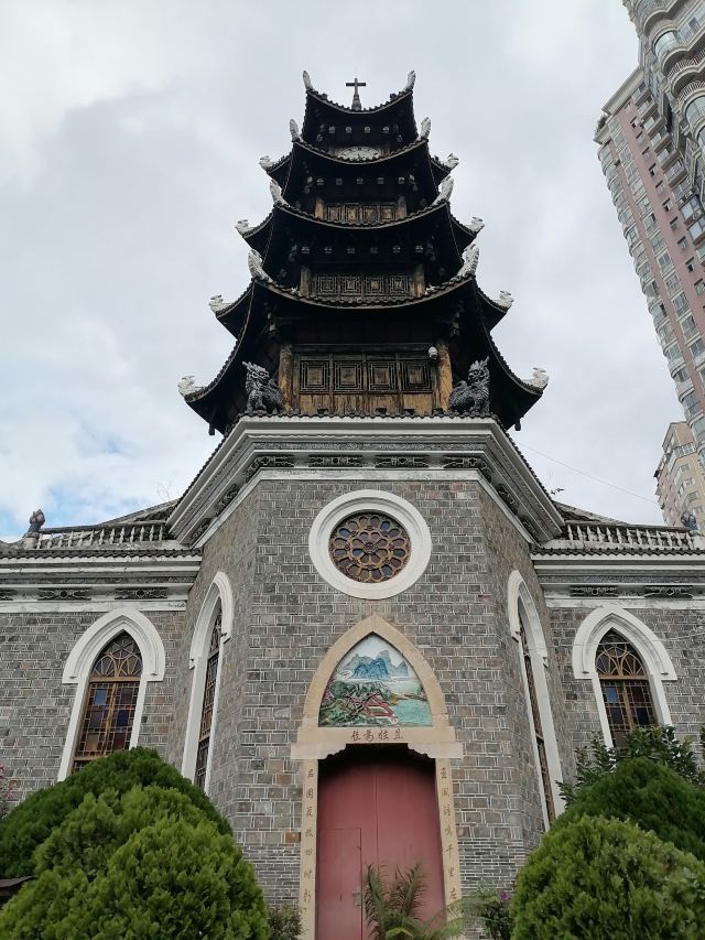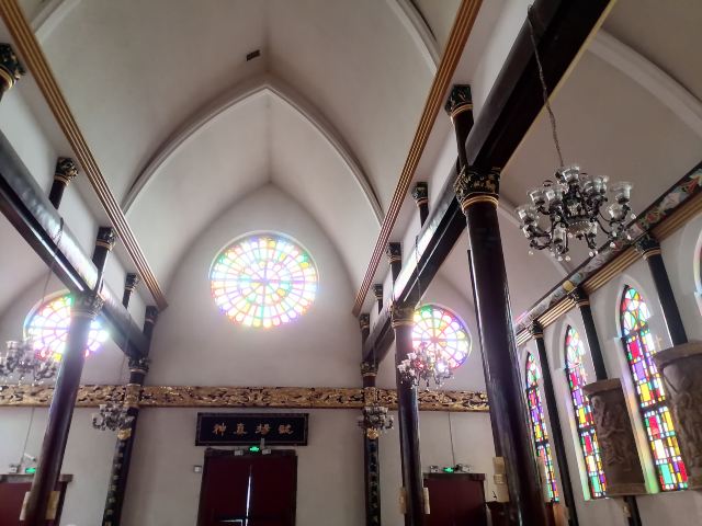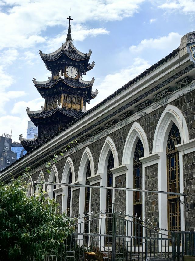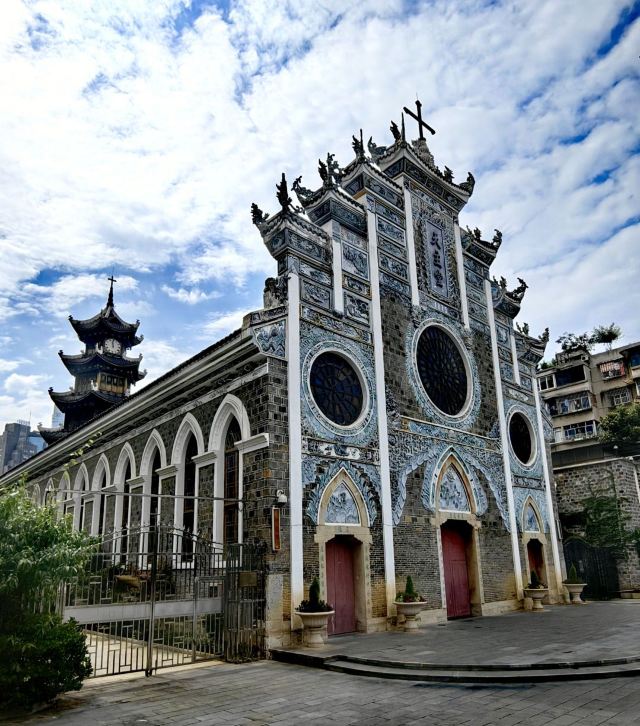 贵阳北天主教堂位于中国贵州省贵阳市,是一座具有历史和文化价值的宗教建筑。建筑风格中西合璧,五层塔与十字架,马头墙与玫瑰窗,奇妙的混搭在这儿刚刚好。 山水花鸟彩绘雕,九色玻璃圣母像依然保存完好,除了礼拜之外还会有新人来此举行婚礼。教堂不仅是宗教活动的场所,也是贵阳市民和游客了解天主教文化的窗口。每周的弥撒和节庆活动对公众开放,游客可以在此感受到浓厚的宗教氛围。教堂内的宁静环境适合静思和祈祷,是繁忙城市中的一片净土。