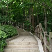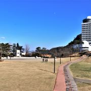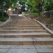 到了山脚下,你可以看到喷泉广场,这里也因《巴黎恋人》而为人熟知。喷泉广场的左边的里侧静静地伫立着安重根义士纪念馆。纪念馆面前排列着许多纪念碑,上面刻着安重根的作品。从喷泉广场下台阶,就能看到三顺台阶,很多人都因为这部偶像剧来这里爬一下。