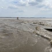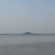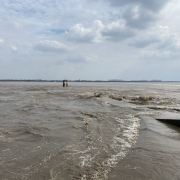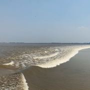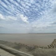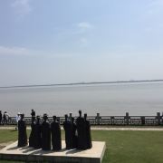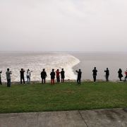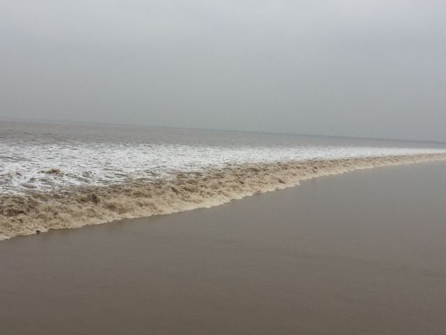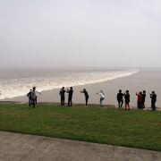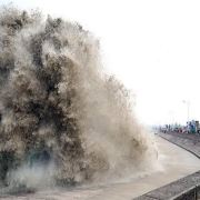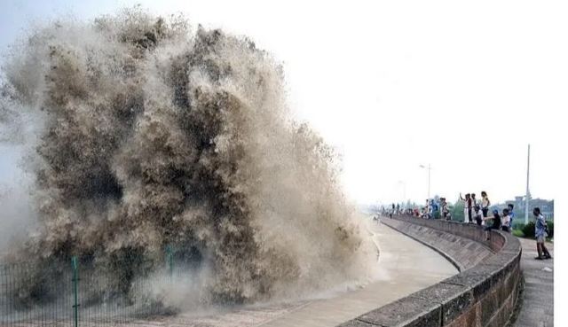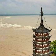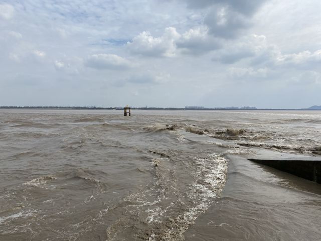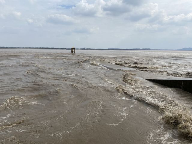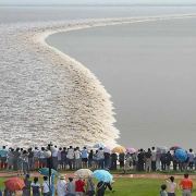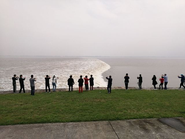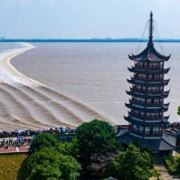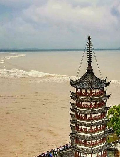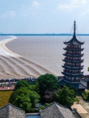 2.盐官镇东8公里的八堡。此处可以观赏到潮头相撞的奇景。海潮涨入江口之后,因为南北两岸地势不同,潮流速度南快北慢,潮头渐渐分为两段。进展神速的南段称为南潮;迟迟不前的北段潮头,在北岸观潮者看来,是来自东方,故也称东潮。两潮相遇,如山崩地裂,满江耸起千座雪峰,颇为壮观。