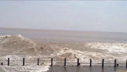 3.盐官镇西12公里的老盐仓。在这里可以欣赏到“返(回)头潮”。这里有一道高9米的“丁字坝”直插江心,潮水至此,气势已经稍减,但冲到丁字坝头,随即潮头转返窜向塘岸,直向塘顶观潮的人们扑来。返头潮的突然袭击,常使观潮者措手不及,惊逃失态。