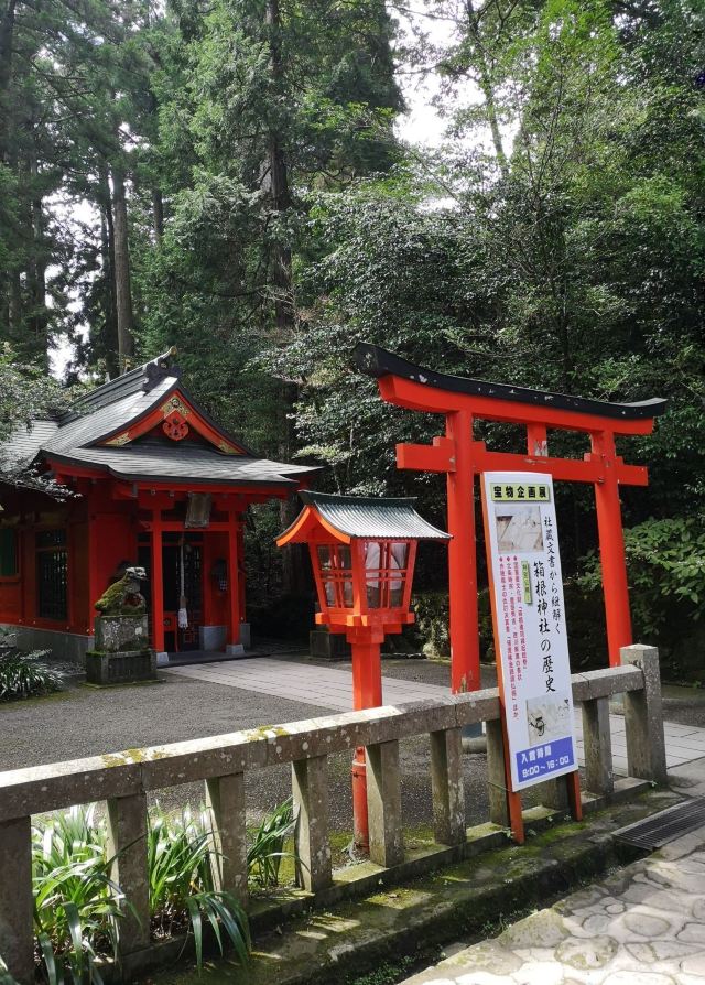 箱根神社于公元757年由万卷上人创建在山岳信仰的圣地箱根山上,曾为源赖朝、德川家康等许多武将所信奉,是具有历史的神社。 这里自古以来就是被尊崇为关东总镇守箱根大权现的有名神社。它有杉树成荫的参拜道、县级指定特别天然纪念物姬沙罗纯林等看点,宝物殿则展出万卷上人坐像、曾我兄弟用过的赤木柄短刀等。