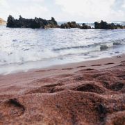 红沙海滩的沙子由一个内陆火山渣锥受侵蚀而成,含有较高的氧化铁。随着太平洋带来的每一次具有很大冲击力的海浪,铁锈色的沙子在海水的影响下呈现出更为浓重的红褐色。站在高处俯视哈纳红沙海滩,展现在眼前的是一个铁锈色的世界。